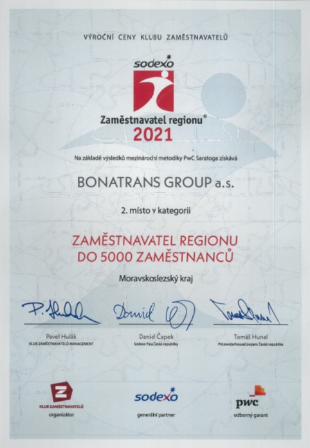 BONATRANS GROUP a.s. získal 2. místo v soutěži „Zaměstnavatel REGIONU 2021 Moravskoslezského kraje“, v kategorii Zaměstnavatelů do 5000 zaměstnanců.