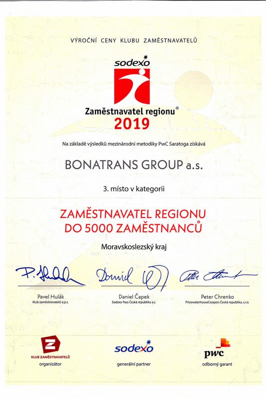 BONATRANS GROUP a.s. získal 3.místo v soutěži „Zaměstnavatel roku 2019 Moravskoslezského kraje“, v kategorii Zaměstnavatelů do 5000 zaměstnanců. Ocenění převzal finanční ředitel pan Tomáš Král.